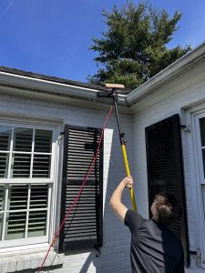The soft brush scrubs the glass, lifts dirt from the frames, and cleans the sills. Then we rinse everything with pure water that dries spot-free—no streaks, no residue.